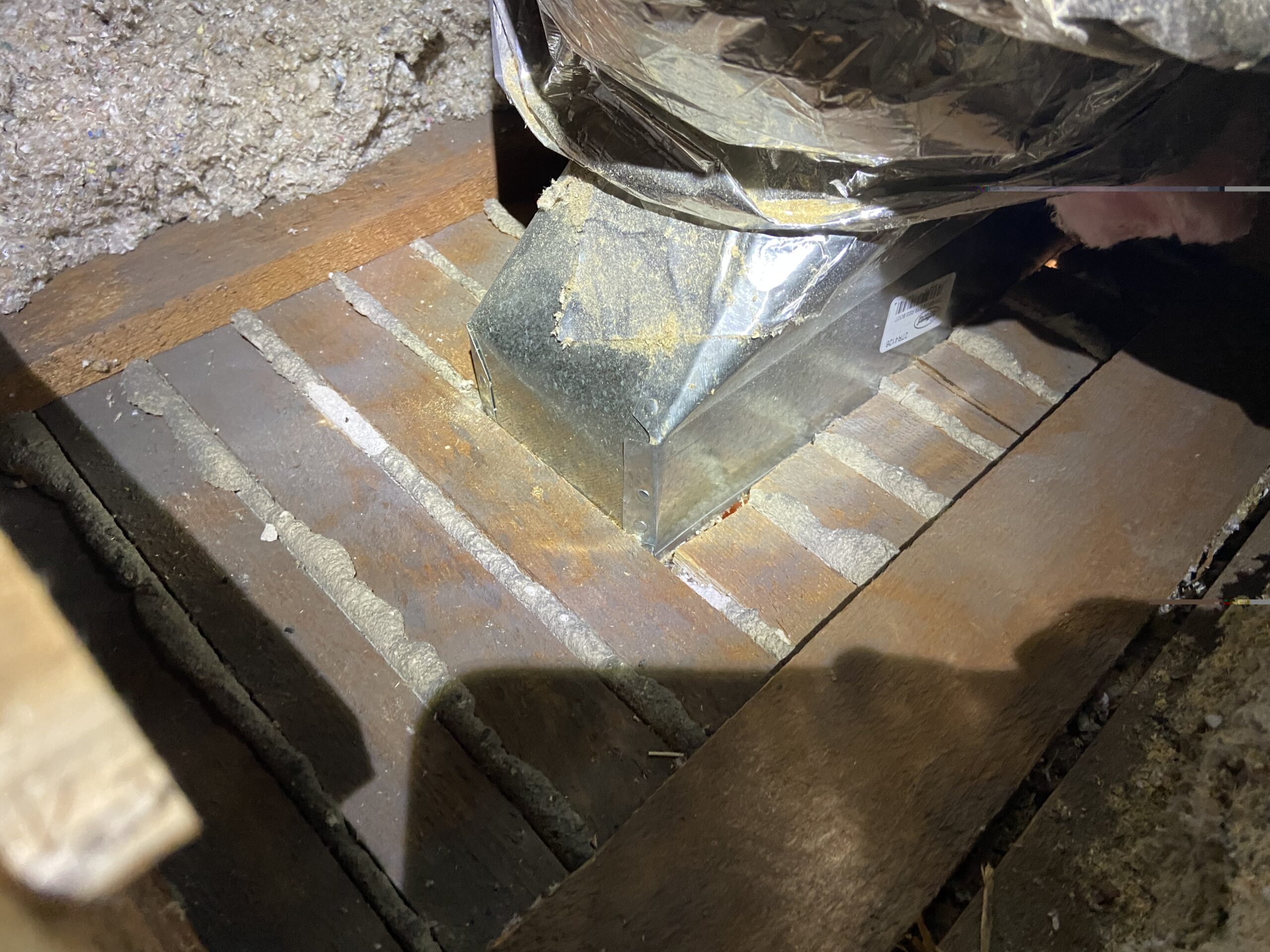The first thing that I had to do was make sure to clean out all of the old cellulose around that straight boot going into the floor. This was part of the prep work that I mentioned before, but I wanted to highlight its importance as it played a key role in deassembling the old duct work, and installing the new ones.