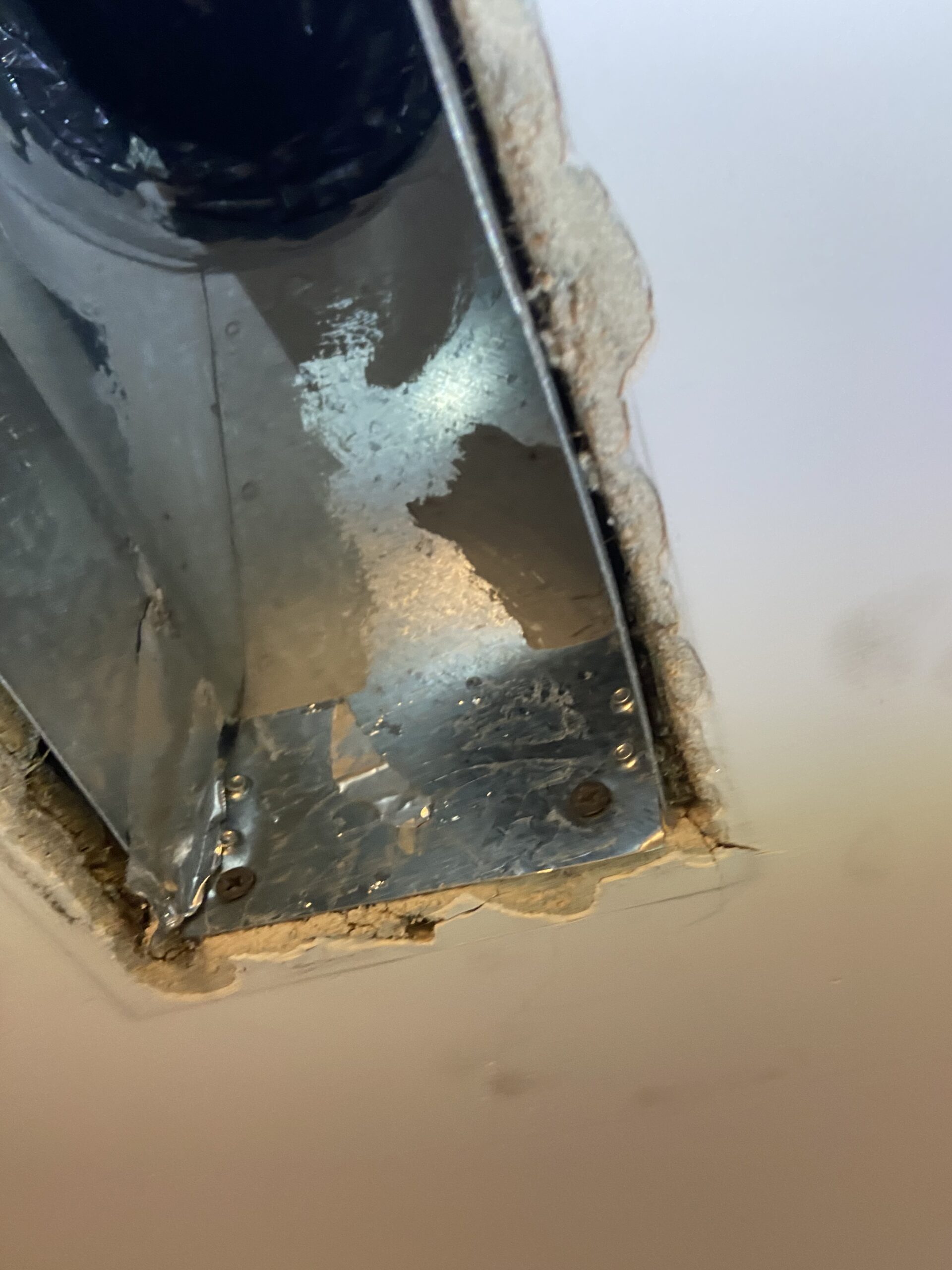 The next thing that we had to do here was grab a ladder and go into the room below, unscrew the diffuser, and then unscrew the screws which were holding things in place. One side was held in at the joist and the rest were punched into the old lathe (something that I really thought was quite fragile to begin with). As you can see, they had used old wood screws, which I frankly disagreed in some capacities as they couldnt get them tight enough, and, it’s really hard to punch those through as opposed to self-tapping sheet metal.
