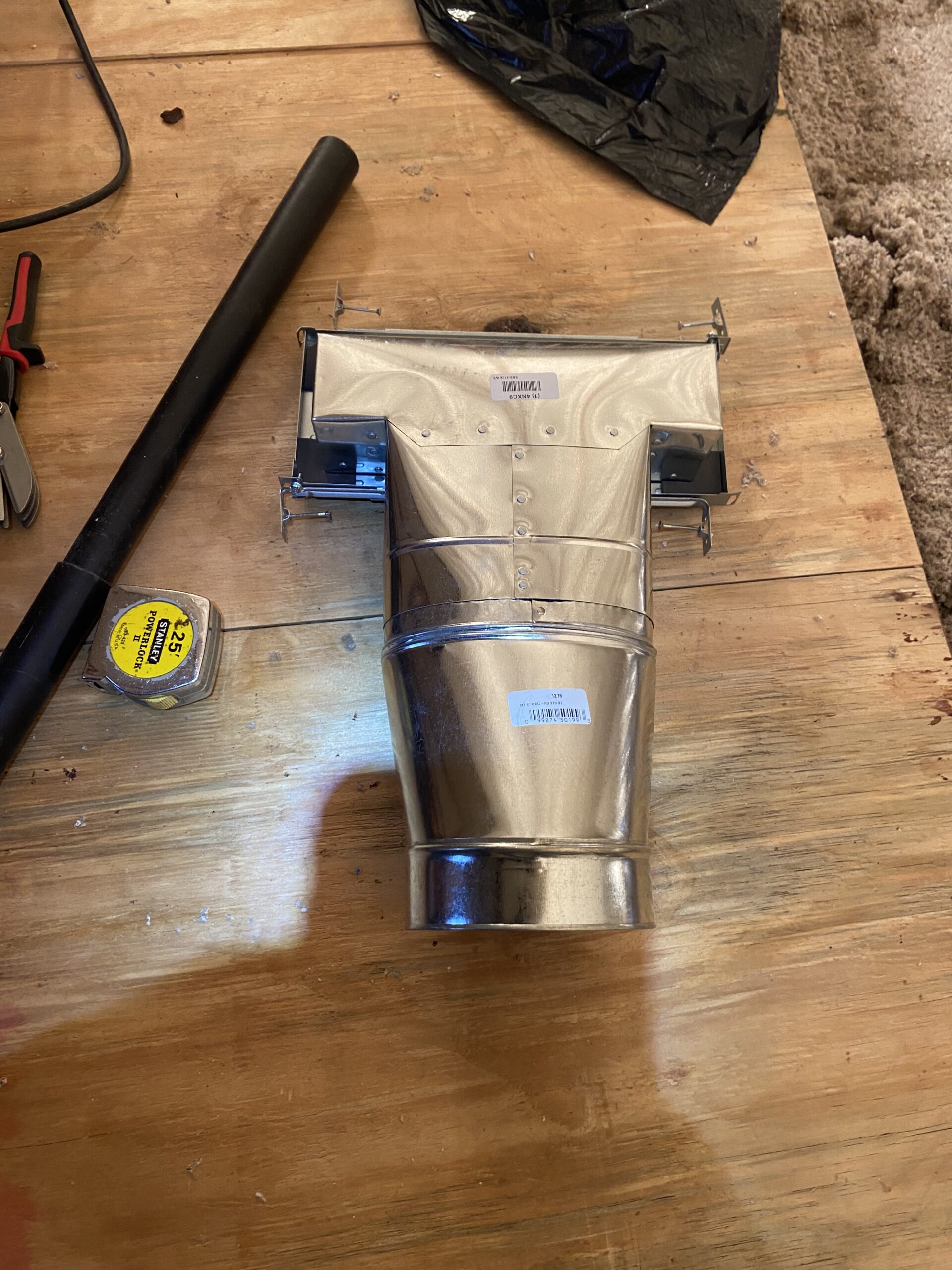 Anyways, after cutting the old flex line off of the old straight boot, I had to connect the oval-to-round adapter to the wall-duct-boot (because the Speedi-Boot was an oval connection and you can’t can’t connect a flex to an oval pipe).