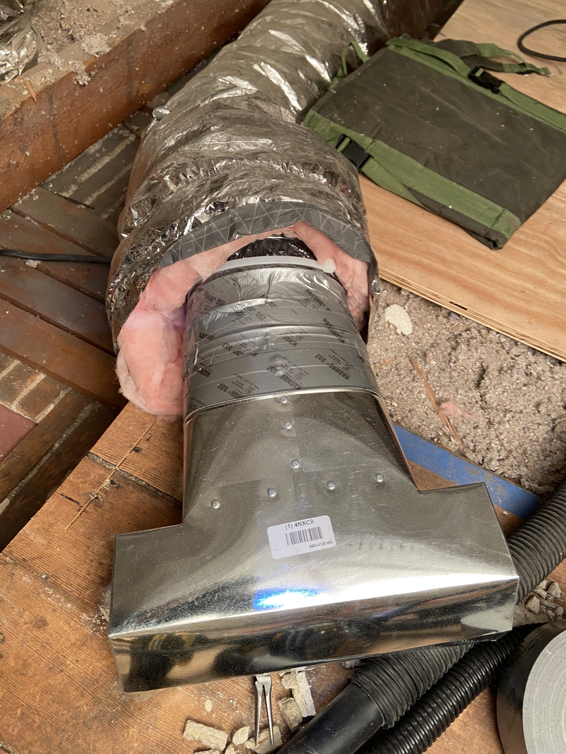 A good practice is to actually cut all of your pieces of tape in advance and have them hanging near you because when you’re holding the boot with one hand with the flex in it’s spot, you need to be quick. It also just speeds up the process of completing the assembly when you have all the pieces of tape ready to go. This little ancedote turned out to be quite critical for the remaining HVAC work up in the attic (and there was quite a bit).