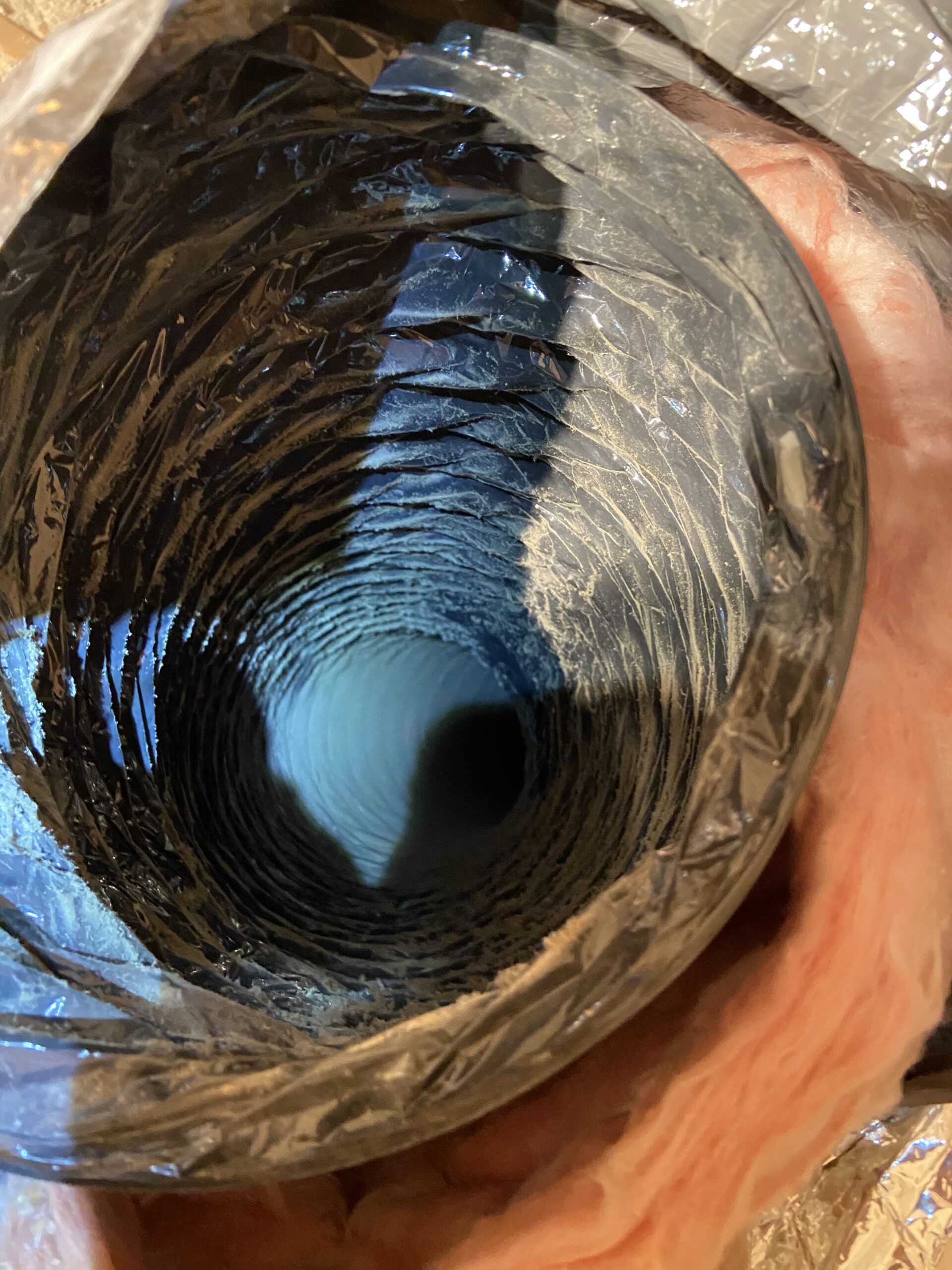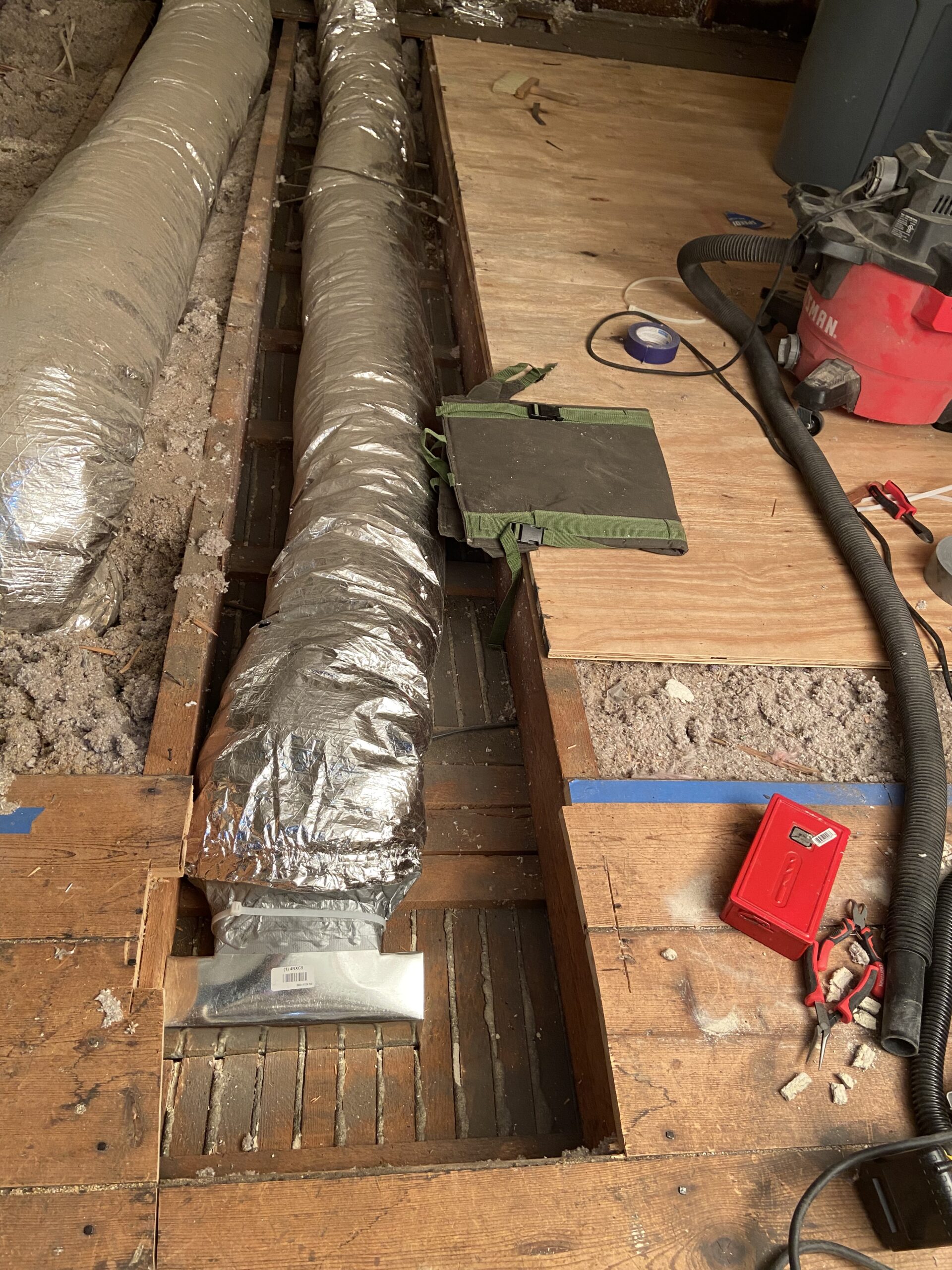 Now, I swapped the boots for the first two flex lines that I did up there (a supply and a return). I used a duster and a vacuum to do my best to clean out the lines, but it was far from perfect. The volume of debris and difficulty cleaning led me to the decision to swap all of the remaining lines out for fresh ones as the workload wasn’t too much more. Additionally, I had old R8 insulation wrap on those lines which made it a bit harder to fit under the subfloor, so swapping them out for R6 paid space dividends.